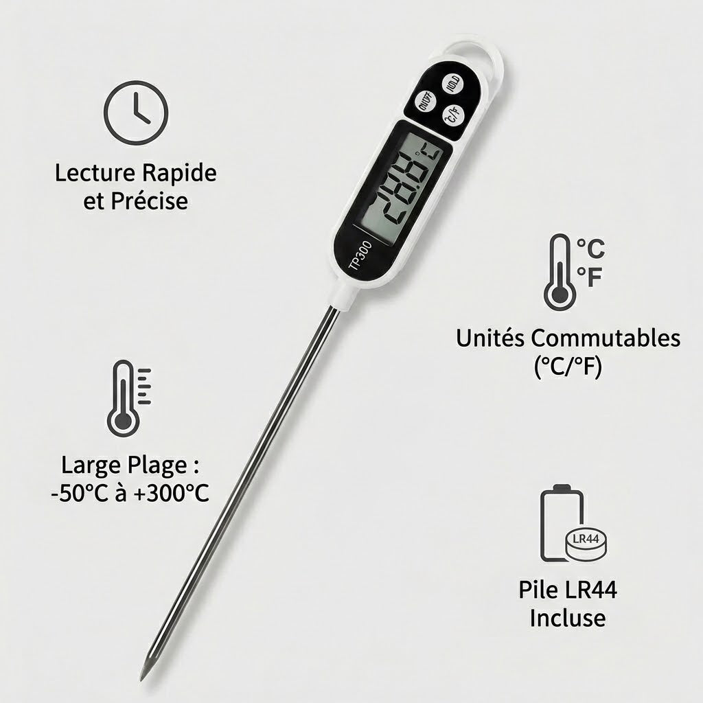 • Plage Étendue : De -50°C à +300°C, idéal pour viandes, liquides et pâtisseries